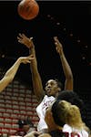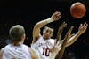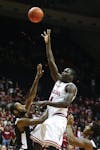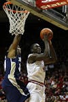 IU senior forward Georgie Jones attempts a shot over a defender Tuesday at Assembly Hall.