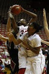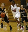 IU freshman point guard Candyce Ussery attempts a shot between two University of Indianapolis defenders Tuesday at Assembly Hall.