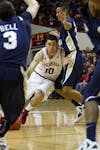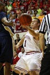 IU Junior point guard Jordan Hulls passes between an UTC defender on the baseline Sunday at Assembly Hall.