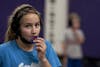 Erica Chapman, 11, readjusts her mouth piece after wrestling her partner Thursday at Bloomington South High School.