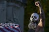 Occupy Bloomington marcher Joshua Johnson yells and raises his fist in agreement with during a speech outside the courthouse Tuesday in downtown Bloomington. The group painted their faces and carried caskets in recognition of the Mexican holiday of Dio de los Muertos.