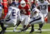 IU Freshman quarterback Tre Roberson runs downfield with 4 Northwestern defenders chasing him Saturday at Memorial Stadium.