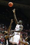 Sophomore guard Victor Oladipo shoots a floater over two University of Indianapolis defenders Saturday at Assembly Hall.