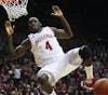 Sophomore guard Victor Oladipo comes down from a dunk during the University of Indianapolis game Saturday at Assembly Hall. IU beat UIndy 90-72.