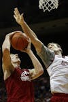 Sophomore Forward Will Sheehey dunks against teammate Tom Pritchard during the dunk contest Saturday at Hoosier Hysteria at Assembly Hall.