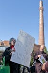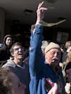 Bloomington resident Joe Varga yells for people to join in the Occupy Bloomington march Saturday in downtown Bloomington.