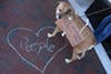 A dog stands outside of Chase bank with its owner Saturday in downtown Bloomington.