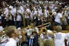 Members of the IU pep band perform "Shout" during Hoosier Hysteria Saturday at Assembly Hall.