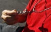 Gustabo Meza shows off his homemade crucifixion necklace made from a bike chain on Friday at The Chocolate Moose.