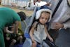 Ross Martinie-Eiler and his wife Andrea put helmets on their children Paul (left) andTressa (right) on Friday at The Chocolate Moose.