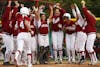 Infielder Samantha Berenter is met with cheers by her teammates after she hits a home run in the second game of a double header against Northwestern on Sunday at Sembower Field.