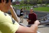 Thomas Buhls (center) is surrounded by counter-protesters that were angry about the pro-confederacy sign he held Saturday outside of the Monroe County Courthouse.