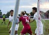Sophomore defender A.J. Palazzolo jumps to head the ball after a corner kick against Virginia Commonwealth University on Sept. 7 at Bill Armstrong Stadium. IU defeated VCU, 5-0.