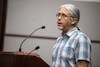 Steve Cotter, natural resources manager for the Bloomington Parks and Recreation Department, talks about the deer population during a hearing over a proposed deer hunting amendment Sept. 19 in City Hall.