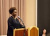 Tracy K. Smith, the 52nd United States poet laureate, smiles during her introduction at a poetry reading Thursday evening in the Neal-Marshall Black Culture Center.