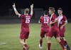 The IU men’s soccer team celebrates after senior Rece Buckmaster scores IU’s fifth goal Sept. 7 against Virgina Commonwealth University at Bill Armstrong Stadium.