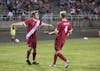 Senior Trevor Swartz celebrates with sophomore A.J. Palazzolo after IU's goal Sept. 7 at Bill Armstrong Stadium. Swartz was awarded Big Ten and national weekly honors Tuesday.