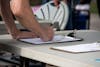 A dog owner signs his pet up for the "most photogenic dog" competition" Aug. 9 during the Drool in the Pool event at Mills Swimming Pool.