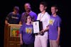 A member from the Montgomery Bell Academy in Nashville, Tennessee, accepts the award for Overall Outstanding Promoter Chapter for the 2017-2018 academic year at the Best Buddies Leadership Conference on Friday evening in the IU Auditorium.