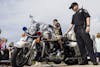 Patrol Officer Mathew Lewis steadies a motorcycle after placing a child on the seat at the “Touch a Truck” event in the Chick-fil-A parking lot at 3020 E. Third St. The motorcycle was one of two recently acquired by the IU Police Department.