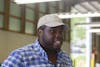 Vauhxx Booker of Bloomington’s Black Lives Matter talks about the armored vehicle at its public unveiling July 10 in the Switchyard Operations building. Booker has been a vocal critic of the decision to purchase the armored vehicle.