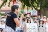 A woman talks about her time as an immigrant in the U.S. at the #FamiliesBelongTogether rally Saturday morning outside the Monroe County Courthouse. Having obtained her green card to the U.S. in 1992, she became a citizen after the election of President Barack Obama, saying that was when she decided “I want to belong to that country.”