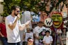 Manuel Diaz-Campos, president of the 9th district Indiana Latino Caucus, speaks during the #FamiliesBelongTogether rally Saturday morning outside the Monroe County Courthouse.