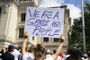 A woman holds a sign that reads “we are a gentle, angry people” at the #FamiliesBelongTogether rally Saturday morning outside the Monroe County Courthouse.