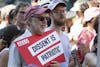 Marcela Weltsek-Medina, a student at the Project School in Bloomington, rests her head during the #FamiliesBelongTogether rally Saturday morning outside the Monroe County Courthouse. Medina was also one of the speakers during the rally.