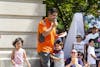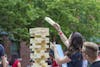 An attendee places a giant jenga block on top of the tower Saturday, June 23, at Showers Plaza as part of the 36th annual Taste of Bloomington.