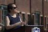 IU Provost Lauren Robel talks to the crowd during a press conference Wednesday, June 20, outside City Hall. The University partnered with the city of Bloomington to bring the Pace bike share service to residents, students and visitors.