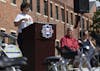 Mayor John Hamilton speaks at the press conference unveiling Bloomington’s new bike share program Wednesday, June 20, outside City Hall. Hamilton said that in addition to taking some cars off the streets of Bloomington, the program will enhance the city’s accessibility, environmental integrity, asthetic appeal and overall health outcome.