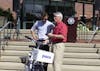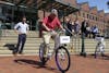 Mayor John Hamilton tries a Pace bicycle for the first time Wednesday, June 20, outside City Hall as part of the press conference unveiling the new bike share service. The service will be available to residents, visitors and students starting this month.