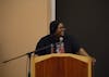 Alexus Tucker, special assistant to the office of Sen. Joe Donnelly, reads a statement from Donnelly at the Juneteenth celebration Tuesday, June 19, in the Neal-Marshall Black Culture Center.
