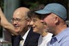 Chuck Carney, director of Media Relations at IU; Maria Calassare, owner of Piccoli Dolci; and Geoffrey McKim, adjunct instructor at IU, share a laugh before the start of a press conference Wednesday, June 20, outside City Hall. The press conference highlighted the city of Bloomington and IU's new bike share program through Pace.