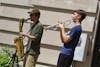 Bloomington High School North students John Layton, left, and Jona Rickert, right, perform at the Wear Orange event Friday, June 1, at the Monroe County Courthouse. The event was put on by the local chapter of Bloomington’s Moms Demand Action, which focuses on common-sense gun reform.