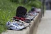 Ninety-six pairs of shoes line the curb Friday, June 1, outside the Monroe County Courthouse, representing the 96 lives lost each day to gun violence. The event was put on by Moms Demand Action for Gun Sense in America, an organization created to demand common-sense gun reform from legislators, companies and educational institutions.