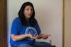 Courtney Daily, the local chair for the Bloomington chapter of Moms Demand Action for Gun Sense in America, talks with a reporter at the Wear Orange event Friday, June 1, outside the Monroe County Courthouse. The event was put on to bring attention to common-sense gun reform.