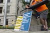 A sign sits propped up at the Wear Orange event Friday, June 1, outside the Monroe County Courthouse. The event was put on to bring attention to common-sense gun reform.