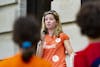Children listen while Courtney Daily, the local chair for the Bloomington chapter of Moms Demand Action for Gun Sense in America, speaks at the Wear Orange event Friday, June 1, outside the Monroe County Courthouse. Orange was chosen because of its use by hunters to signal the presence of human life.