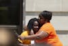 Fifth grader Sydney Crossley is embraced by her mother, Jennifer, after Sydney delivered her speech at the Wear Orange event Friday, June 1, outside the Monroe County Courthouse. Crossley and seventh grader Charlotte Siena addressed gun violence, as well as the recent school shootings around the country, at the event.
