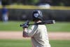 Noblesville High School senior Bryce Randolph waits for a pitch during an IHSAA playoff games Monday, May 28, at Dunker Field in Noblesville. Heart symbols were worn on the back of Noblesville's batting helmets in recognition of the school shooting that took place Friday, May 25, at Noblesville West Middle School.