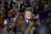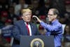 President Donald Trump invites Mike Braun, who won the Indiana Republican primary for the U.S. Senate election Tuesday, to the stage to speak in the North Side Middle School gymnasium on Thursday, May 10, in Elkhart, Indiana.