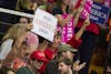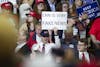 An audience member holds up a custom sign that reads "CNN is very fake news" at a Donald Trump rally Thursday, May 10, in Elkhart, Indiana. Event rules stated no outside or custom signs were allowed in.