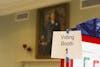A sign hangs on a voting booth Tuesday, May 8, inside the Indiana Memorial Union.