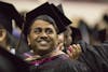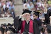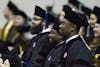 A graduate student looks into the audience after President Michael A. McRobbie asks graduates to stand and recognize friends and family who helped them along the way during spring commencement for graduates. The spring ceremony for graduates took place Friday, May 4, in Simon Skjodt Assembly Hall.