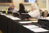 Voting officals talk while waiting for voters Tuesday, May 8, inside the Indiana Memorial Union.