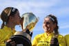 Rachel Brown kisses the first place trophy after Kappa Alpha Theta won the 2018 women’s Little 500.
