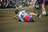 A Kappa Kappa Gamma rider falls during the handoff with her team during the women’s Little 500.