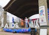 Argenta Peron and Jeremy Turner introduce the South Central Indiana AIDS Walk with opening remarks Friday at the Waldron Hill Buskirk Park. Peron flew in from Hawaii to participate in the event to raise awareness in the fight against AIDS.